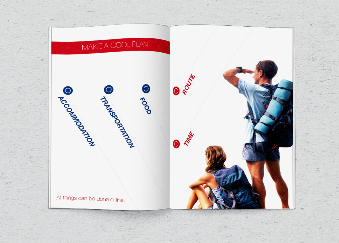 In this project, I create a new travel agency brand. This travel agency breaks through from the traditional travel agency services, to make the services customized. Anybody who has cool ideas for traveling can be realized under the support with our services. In the other words, you make a plan, people will find your plan online and follow your plan, then we help you to revise it and realize it. So we will launch the services on our website firstly and also through the App, and at the same time we will distribute it on social media. Also the traditional off-line branding methods will be used in this whole process.